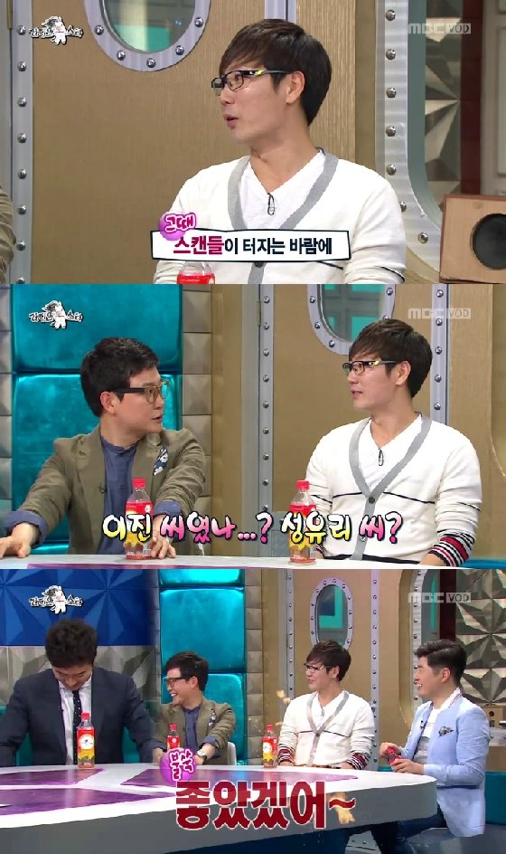 송종국은 "내가 아니다. 당시 스캔들이 연이어 터진 바람에 루머로 이어졌다"고 설명했지만, 김성주는 "이진 씨였나, 성유리 씨였나?"라고 당시 스캔들을 직접 언급했고, 안정환은 "좋았겠다"며 맞장구를 쳐 송종국을 당황하게 했습니다.