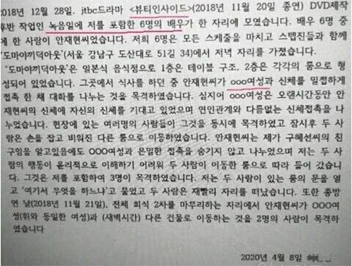 며칠 전 네이트판과 인스타그램에 진술 내용 일부가 정리된 듯한 사진이 떴다가 삭제되었는데요, 이 글의 작성자 이름은 안재현과 함께 드라마를 찍은 여배우였습니다.