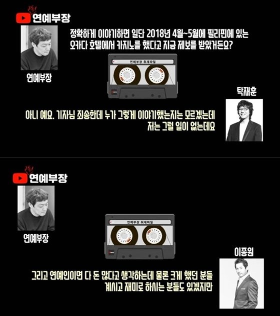 하지만 탁재훈은 해당 사실을 전면 부인했고, 이종원은 일부는 인정했지만 상습은 아니었으며 쓸 수 있는 돈도 한계가 있었다고 해명했습니다. 이날 김용호는 "도박사건을 취재를 하면서 계획을 세웠다. 저 나름대로 수싸움을 하고 있다. 지금 여러가지 상황들이 만들어지고 있다"고 말했습니다.