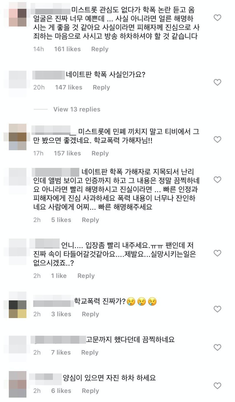 진달래의 인스타그램에는 해명을 요구하는 네티즌의 댓글이 쏟아졌습니다. 네티즌들은 "사실 아니라면 얼른 해명하시는 게 좋을 것 같다", "네이트판 학교 폭력 사실인가요?", "미스트롯에 민폐 끼지치 말고 티비에서 그만 봤으면 좋겠네요" 등진달래 학폭 논란에 대한 입장을 밝혀 달라고 요구했습니다.