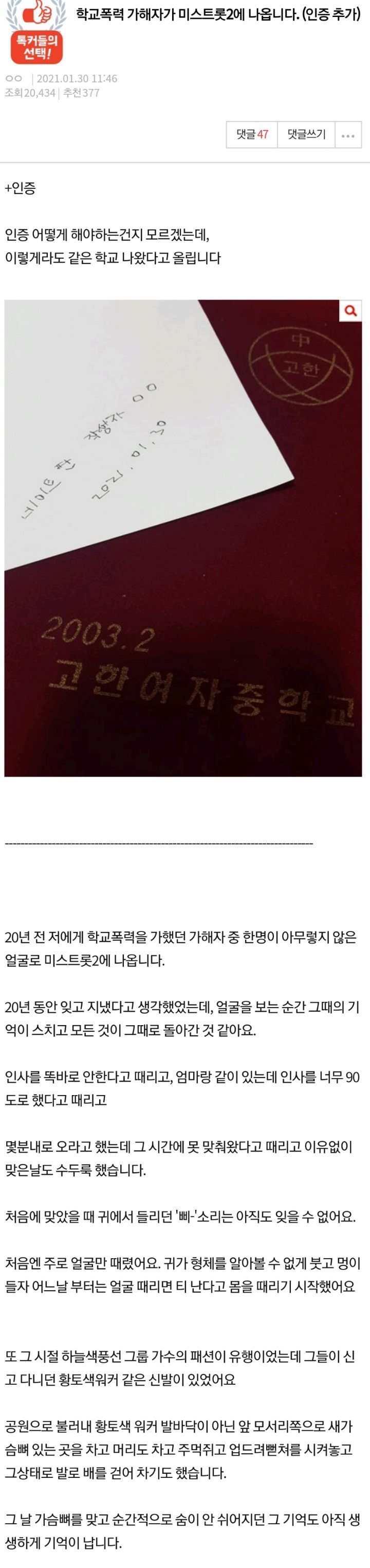 작성자는 "20년 전 저에게 학교폭력을 가했던 가해자 중 한 명이 아무렇지 않은 얼굴로 미스트롯2에 나온다"며 "잊고 지냈다고 생각했었는데, 얼굴을 보는 순간 그때의 기억이 스치고 모든 것이 그때로 돌아간 것 같다"고 말했습니다.