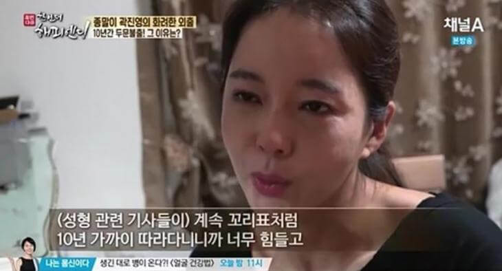 곽진영은 방송에서도 악플에 상처를 많이 받았다고 털어놓기도 했는데요. 곽진영은 “맨날 댓글에 시달리는 성형 얘기가 나한테는 상처”라며 “곽진영을 검색하면 갓김치, 성형, 성형중독이 나오는데, 내가 민폐를 끼친 것도 아니고 죽을 만큼 잘못했을까 싶다”고 말하기도 했습니다. 이어 “댓글에 시달리고 있지만 나는 잘 버티고 있다”며 “나는 지금 내 삶이 제일 행복하다”고 밝혔습니다.