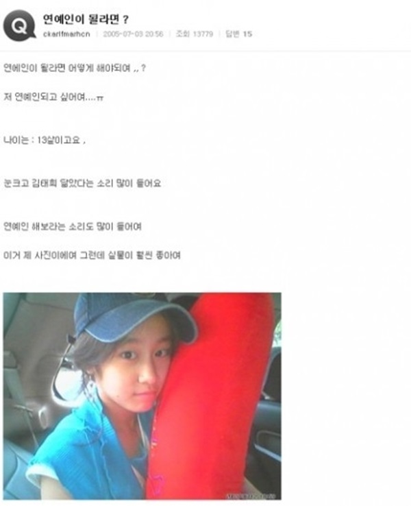 그러던 어느날 어머니와 함께 고 최진실이 나오는 드라마를 본 뒤 "나도 저거 하고 싶다"는 생각을 했고 이를 계기로 지연은 연기 학원을 다니게 되는데요. 이 시기(2005년)에 초등학교 6학년이었던 지연은 '네이버 지식인'에 "연예인이 될라면 어떻게 해야되요?, 나이는 13살이고요, 눈크고 김태희 닮았다는 소리 많이 들어요. 제 사진인데 실물이 훨씬 좋아요"라는 글 내용과 자신의 셀카사진을 함께 올리기도 합니다.