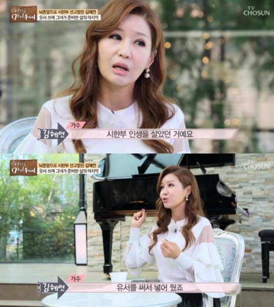 김혜연은 당시 "혈관을 찾지 못하면 대형 수술을 받아야 하는 상황이었다. 그래서 아무도 모르게 하루하루를 정리하고, 부모님이 걱정돼 유서도 써두었었다"고 말해 안타까움을 자아냈습니다.