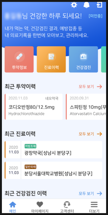 보건복지부에서 만든 '나의 건강기록'앱을 이용하면 1~10년까지 투약정보, 진료 및 건강검진 상세이력 등을 손쉽게 확인 할 수 있습니다. 위의 링크를 클릭하시면 상세내용을 볼 수 있습니다.