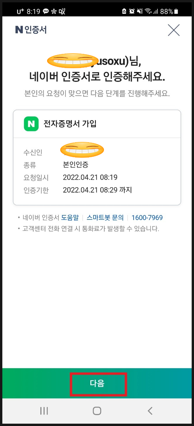 아래 필수인 부분을 선택 한 후 신청하기를 클릭해 줍니다. 그러면 네이버 인증서 간편 인증을 하게 됩니다. 저는 지문으로 등록을 해놨기 때문에 지문으로 진행 했습니다.
