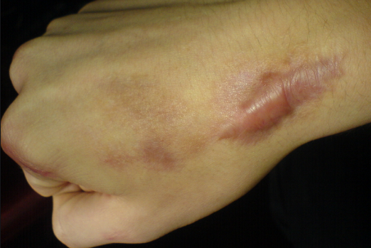 1) 작은 상처에도 흉터가 크게 생기고 딱딱한 표면을 가진 경우 켈로이드 피부일 수 있습니다.(사전 확인 필요)