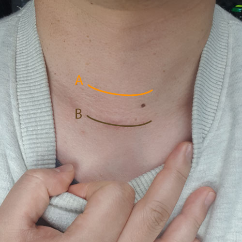 보통 B의 경우 목걸이 라인에 맞춰 절개를 했다고 하더군요. 참고로 아래의 사진은 실제 제 목을 찍은 사진입니다.