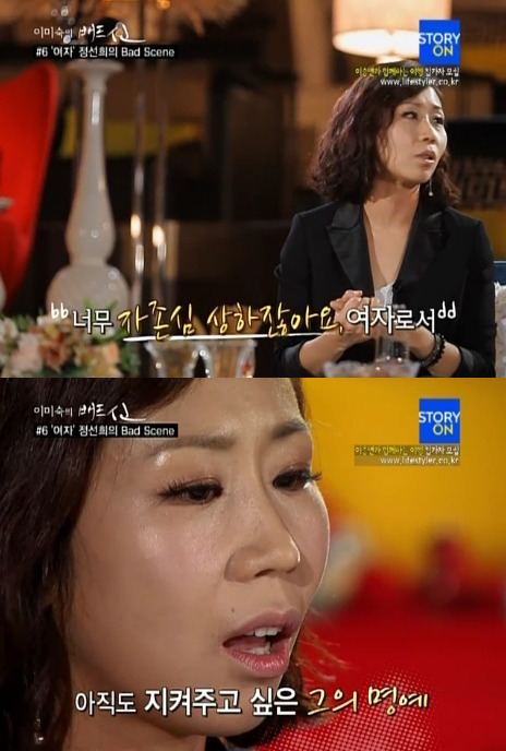 정선희는 "내가 여자로서 받을 충격에 대해서는 보듬을 엄두도 못 냈고 바라지도 못했다. 분명 사랑이라고 믿고 있는데 이건 사랑이 아니었나? 배신 당한 건가? 이런 생각이 하루에도 열 두 번 씩 왔다갔다했다"며 "너무 자존심이 상하고 여자로서 창피했다.