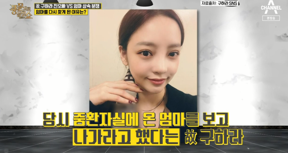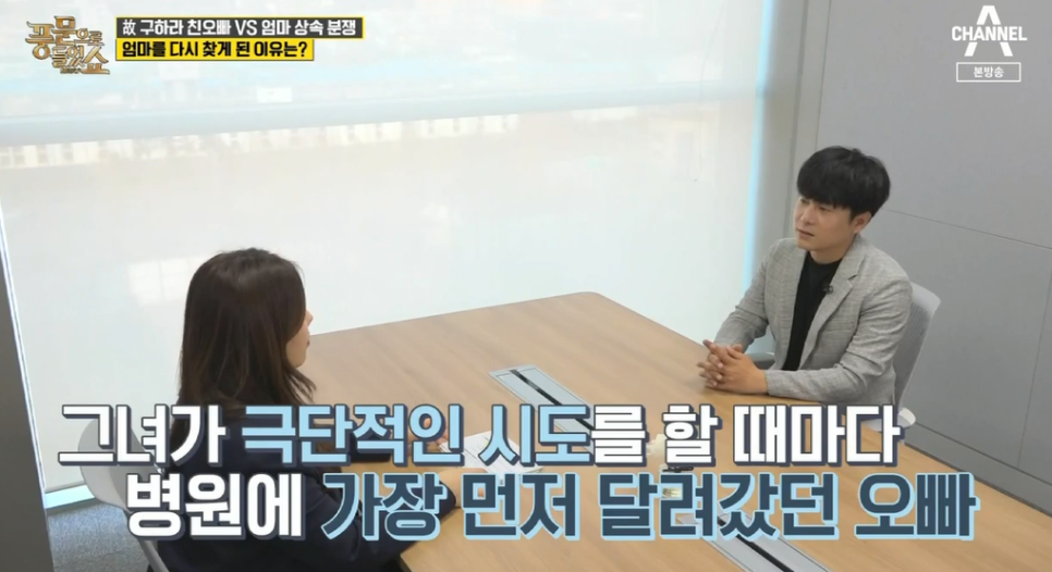 구하라가 극단적인 시도를 할 때마다 가장 먼저 간 것은 오빠라고 하는데요, 하지만 병원에서는 보호자로 부모를 요구했고 어느 날, 아빠가 올 수 없는 상황에 놓여 어쩔 수 없이 엄마에게 연락을 했다고 합니다.
