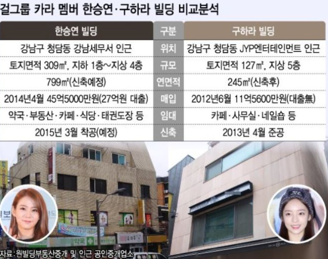 구하라는 과거 11억 5600만 원에 매입한 청담동 단독주택을 신축해 보증금 7000만 원, 월세 750만 원에 임대한 적이 있었으며, 이후 2015년 이 주택을 20억 8000만 원에 매각해 엄청난 시세차익과 임대수익을 올렸습니다.