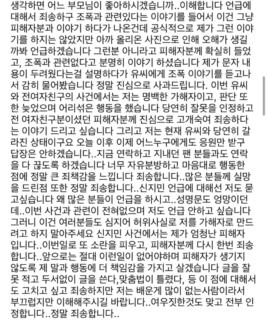 이어 "A씨와는 갈라진 상태"라며 "전 여자친구분이신 피해자분께 진심으로 고개 숙여 죄송하다는 이야기를 드리고 싶다"고 말했습니다.