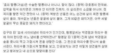 "000이 빨통(가슴)이 자연산이라고 하는데 뭐 재수 좋은 년들은 살이 찌면 빨통으로..."
