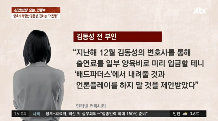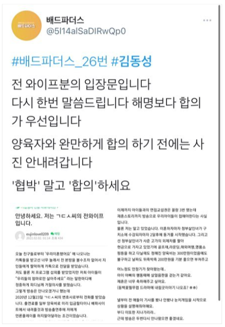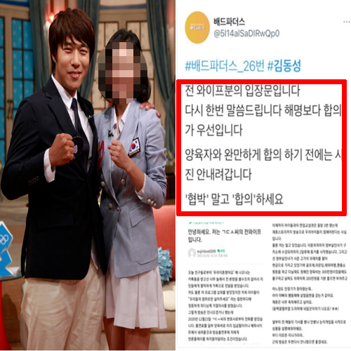 이어 양육비 지급에 대해 김동성 측으로부터 제안받은 내용을 전했는데요, "지난달 김동성 변호사로부터 출연료를 일부 양육비로 입금할 테니 배드파더스 사이트에서 내려줄 것과 방송 후 저에게 언론플레이 하지 말아 달라는 조건(을 전달받았다)"고 전했습니다.