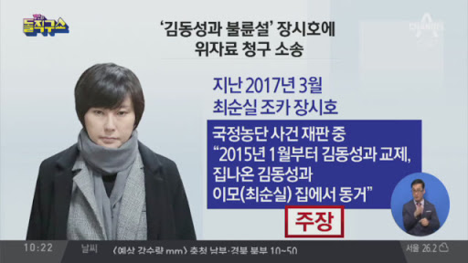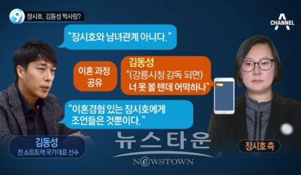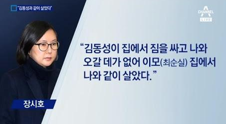 장시호는 2015년에 김동성과 사귀었다고 하면서 이 말을 일부 인정하고, 심지어 이혼도 안 한 상태에서 집을 나와 최순실의 집에서 둘이 같이 살았다고 합니다. 3월 31일, 김동성은 '결혼 전인 1999년경 1년 정도 교제하다 결별했으며, 아내도 두 사람이 과거에 사귀었던 사실을 알고 있었다'며 반박했으나, 훗날 상간녀 소송에서 장시호가 패소하면서 모든 게 사실인 것으로 드러났습니다.