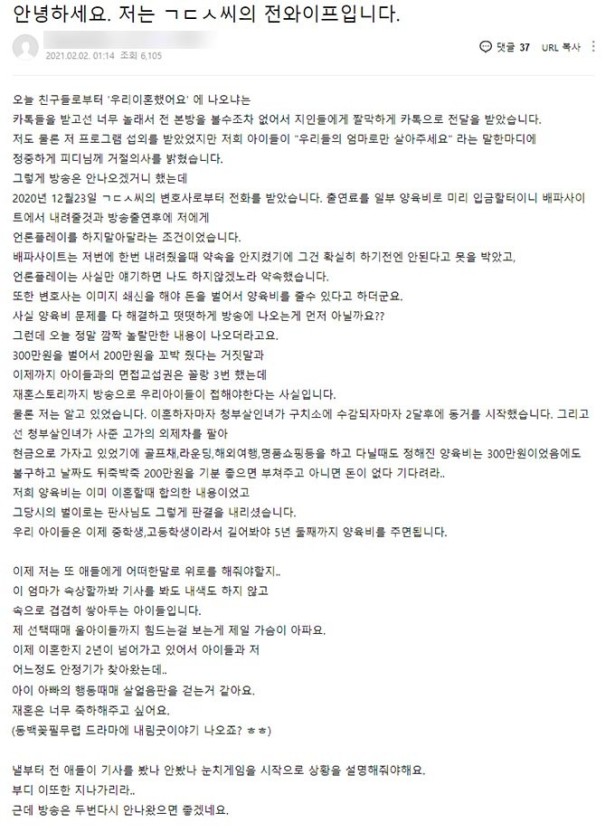 이에 따르면 김동성의 전 부인은 전날인 1일 양육비해결총연합회 카페에 '안녕하세요 저는 ㄱㄷㅅ씨의 전 와이프 입니다'라는 제목의 글을 올렸습니다.