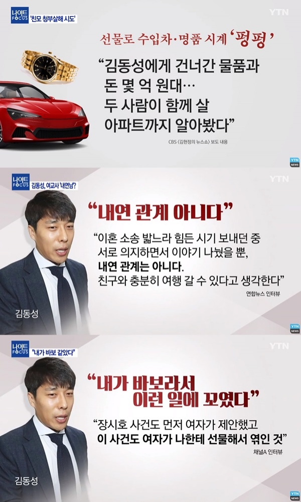 김동성과 여교사는 2018년 4월부터 사귀었는데 이 시기는 김동성이 이혼하기 전, 즉 유부남이었던 때라 충격을 주었는데요, 김동성 본인은 살인 교사와는 아무런 연관이 없다는 것은 명백하다고 하며, 상간녀가 혼자서 한 일이라고 이야기했습니다.