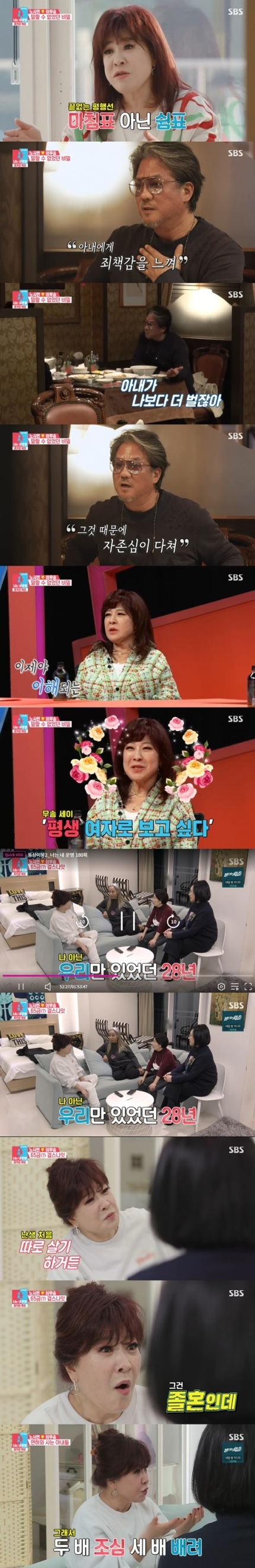 이무송은 “나는 원래 누군가에게 고민 듣고 조언을 건네는 게 위안이 된다”고 털어놨다. 하지만 노사연은 “나만 상담해 주면 좋다. 근데 다른 사람까지 상담해 주는 게 너무 싫다. 내가 싫다고 한 걸 당신이 먼저 시작한거다”고 강조해 보는 이들의 긴장감을 자아냈다.