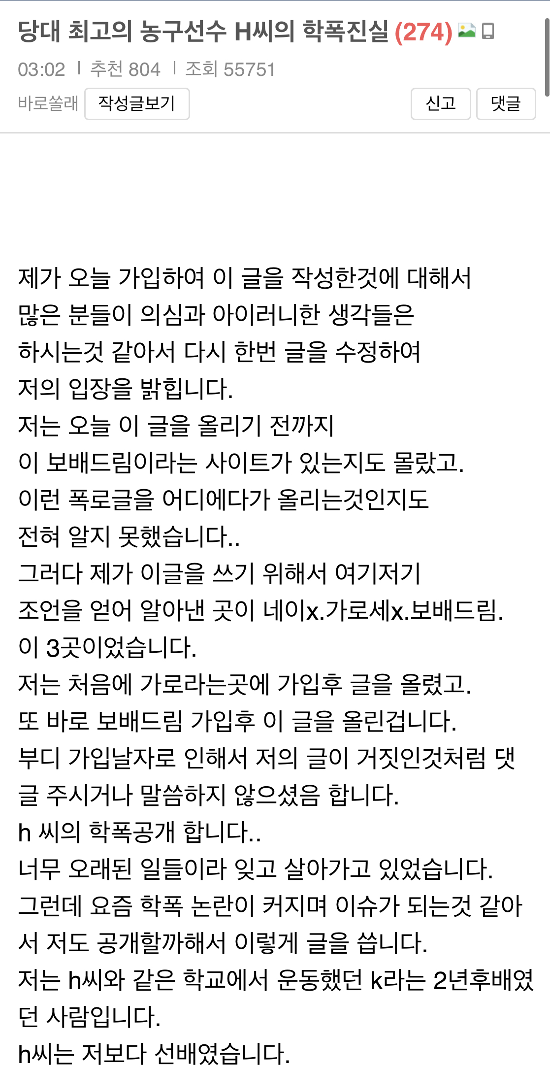 14일 오전 한 온라인 커뮤니티에는 '당대 최고의 농구선수 H씨의 학폭 진실'이라는 제목의 글이 게재되었습니다.