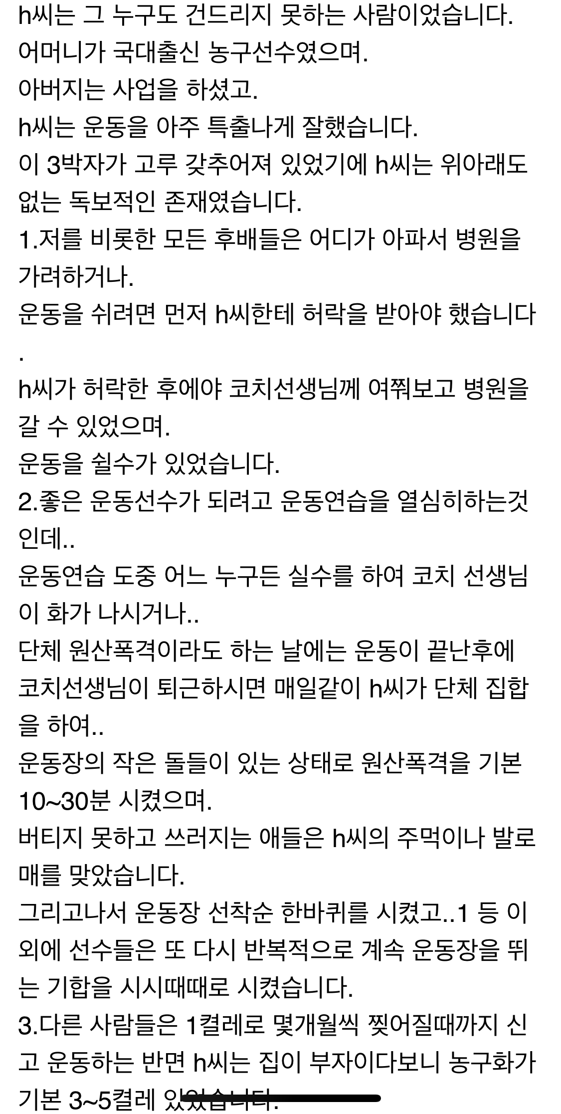 글쓴이 A씨는 자신을 H씨와 같은 학교에서 운동을 했던 2년 후배라고 소개하며 "H씨는 어머니가 국대출신 농구선수였으며, 아버지는 사업을 하셨고, H씨는 운동을 특출 나게 잘했다"며 "이 3박자가 고루 갖추어져 있어 위아래도 없는 독보적인 존재였다"고 설명했습니다.