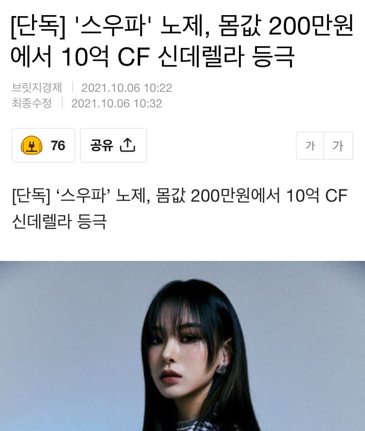 노제는 몸값도 70배 이상 상승했습니다. 스우파 출연 전 노제의 광고 출연료는 200만 원 남짓이었지만, 최근 방송 인기에 힘입어 최고 1억 5000만 원의 CF 계약을 체결했다는 후문인데요, 업계에서는 노제가 9개 CF계약을 체결하면서 약 10억 원을 벌어들일 것으로 추산하고 있습니다.