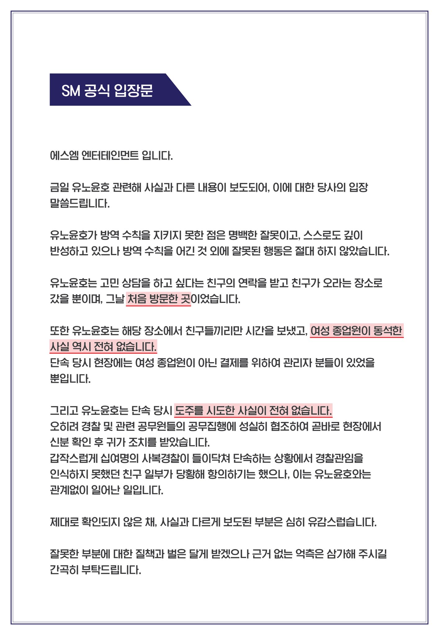 유노윤호 소속사 SM엔터테인먼트는 공식 입장을 내고 "사실과 다른 내용이 보도됐다"며 "방역 수칙을 어긴 것 외에 잘못된 행동은 절대 하지 않았다"고 강조했습니다.