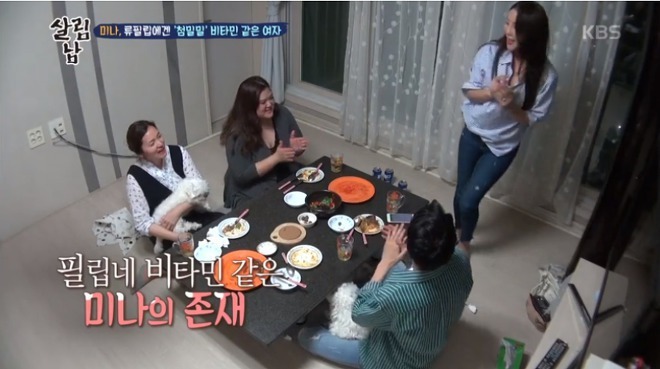 류필립 가족의 안타까운 미국생활 얘기로 침체된 분위기를 업시키려고 갑자기 미나가 노래를 부르며 춤을 추었고, 덕분에 식구들이 다시 웃음을 찾았는데요.