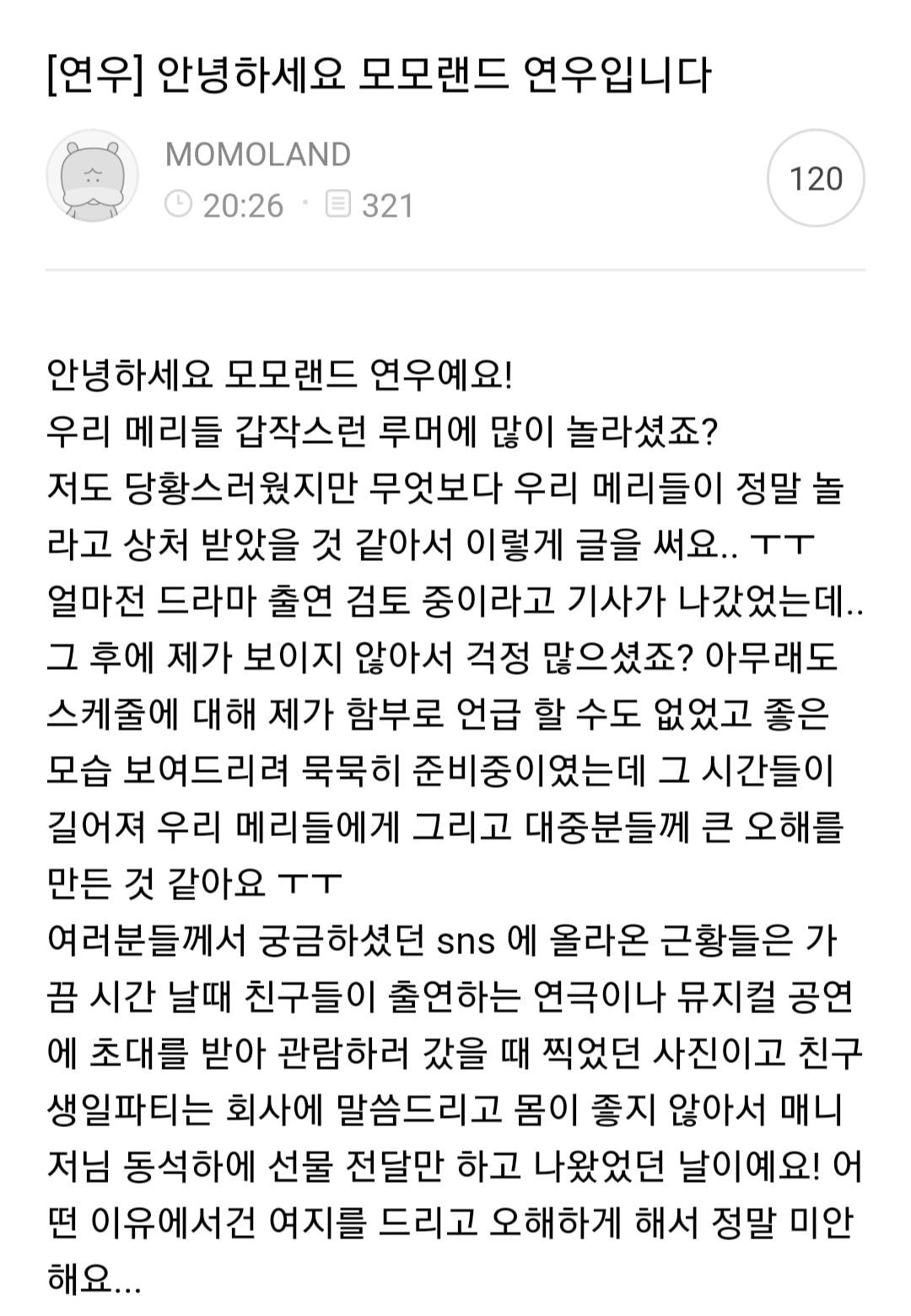 11월 22일에도 연우는 모모랜드 그룹 활동을 안 하는 것에 대한 입장을 직접 밝히기도 했습니다.