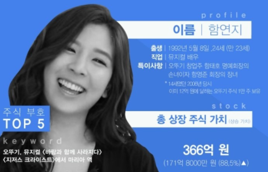 함연지는 오뚜기 함영준 회장의 딸로 화제가 되면서 재산, 주식를 궁금해하는 사람이 많습니다. 오뚜기 주식 43,079주를 보유하고 있다고 하네요. 300억 상당의 주식을 소유한 재벌 3세입니다. 그리고 다른 직업인 유튜브 크리에이터로 샌드박스네트워크와 파트너십을 체결했다고 해요.