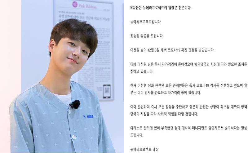 뉴에라는 "이찬원 님이 12월 3일 새벽 코로나19 확진 판정을 받았다"며 "즉시 자가격리에 들어갔으며 방역 당국의 지침에 따라 필요한 조치를 하고 있다"고 밝혔습니다.
