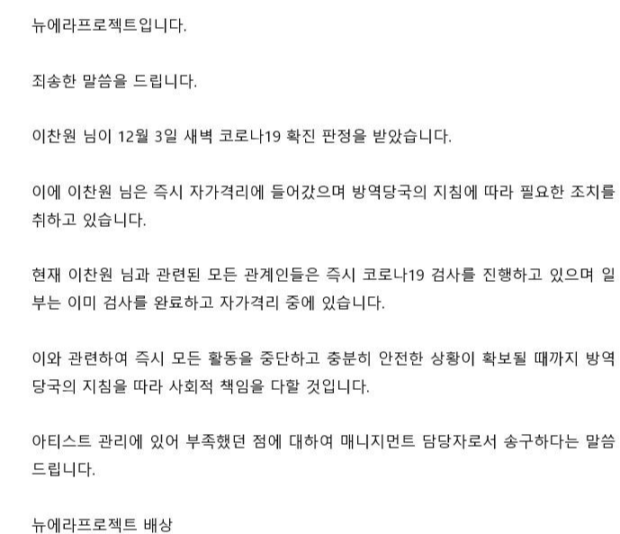 또 "이찬원 관계인들 역시 코로나19 검사를 진행하고 있으며 일부는 이미 검사를 완료하고 자가격리 중"이라며 "즉시 모든 활동을 중단하고 충분히 안전한 상황이 확보될 때까지 방역당국의 지침을 따라 사회적 책임을 다할 것"이라고 말했습니다.