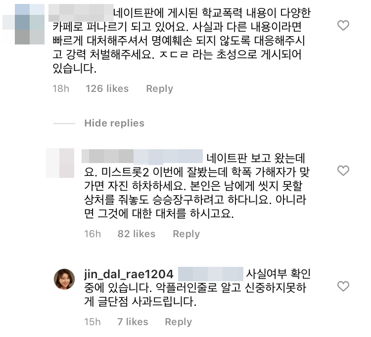 진달래 인스타그램에는 "네이트판에 게시된 학교폭력 내용이 다양한 카페로 퍼나르기 되고 있어요. 사실과 다른 내용이라면 빠르게 대처해주셔서 명예훼손 되지 않도록 대응해주시고 강력 처벌해주세요"라는 댓글이 달렸고, 진달래는 "사실여부 확인 중에 있다"는 입장을 밝혔습니다.