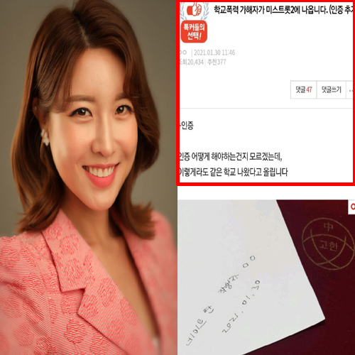 31일 한 온라인 커뮤니티에는 '학교폭력 가해자가 미스트롯2에 나옵니다'라는 글이 올라왔습니다.