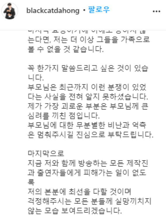 박수홍은 또 "현재는 그동안 벌어진 일들에 대한 객관적인 자료를 확보하고, 다시 한번 대화를 요청한 상태입니다. 마지막 요청이기에 이에도 응하지 않는다면, 저는 더 이상 그들을 가족으로 볼 수 없을 것 같습니다"라고 전했다.마지막으로 그는 "꼭 한가지 말씀드리고 싶은 것이 있습니다. 부모님은 최근까지 이런 분쟁이 있었다는 사실을 전혀 알지 못하셨습니다. 제가 가장 괴로운 부분은 부모님께 큰 심려를 끼친 점입니다. 부모님에 대한 무분별한 비난과 억측은 멈춰주시길 진심으로 부탁드립니다"라며 "지금 저와 함께 방송하는 모든 제작진과 출연자들에게 피해가는 일이 없도록 저의 본분에 최선을 다할 것이며 걱정해주시는 모든 분들께 실망끼치지 않는 모습 보여드리겠습니다"라고 덧붙였습니다.