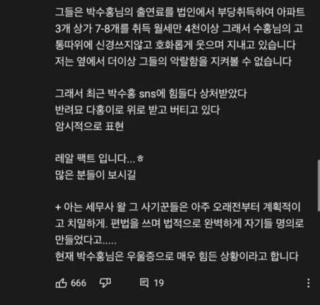 글쓴이는 마지막으로 "그 사기꾼들은 아주 오래전부터 계획적이고 치밀하게 편법을 쓰며 법적으로 완벽하게 자기들 명의로 만들었다고, 현재 박수홍님은 우울증로 매우 힘든 상황이라고 합니다"라고 덧붙였습니다.