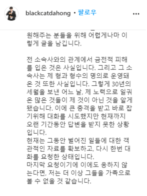 박수홍은 이어 "이는 전 소속사와 문제 이전에 가족의 문제이기에 최대한 조용히 상황을 매듭지으려 했으나 부득이하게 이 같은 상황이 벌어지게 돼, 저를 걱정하고 응원해주는 분들을 위해 어렵게나마 이렇게 글을 남깁니다"라며 "전 소속사와의 관계에서 금전적 피해를 입은 것은 사실입니다. 그리고 그 소속사는 제 형과 형수의 명의로 운영돼온 것 또한 사실입니다. 그렇게 30년의 세월을 보낸 어느 날, 제 노력으로 일궈온 많은 것들이 제 것이 아닌 것을 알게 됐습니다. 이에 큰 충격을 받고 바로 잡기위해 대화를 시도했지만 현재까지 오랜 기간동안 답변을 받지 못한 상황입니다"라고 설명했습니다.