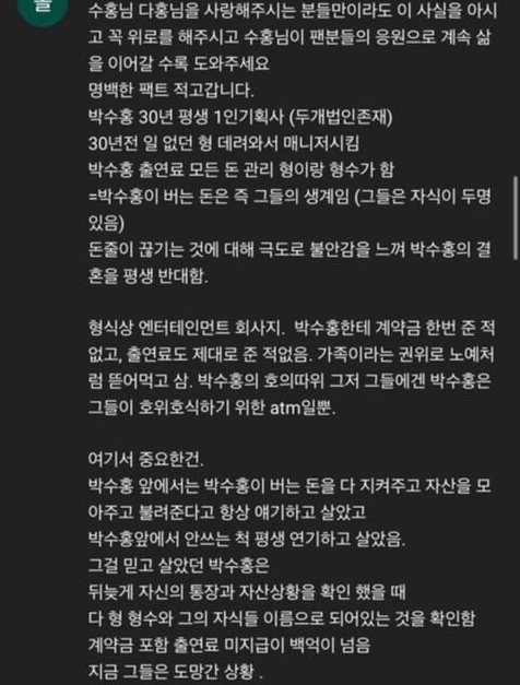 글쓴이는 "여기서 중요한 건 박수홍 앞에서는 박수홍이 버는 돈을 다 지켜주고 자산을 모아주고 불려준다고 항상 얘기하고 살았고 박수홍 앞에서 안 쓰는 척 평생 연기하고 살았음. 그걸 믿고 살았던 박수홍은 뒤늦게 자신의 통장과 자산상황을 확인 했을 때 다 형 형수와 그의 자식들 이름으로 되어있는 것을 확인함. 계약금 포함 출연료 미지급이 백억이 넘은. 지금 그들은 도망간 상황"이라고 충격적인 상황을 밝혔습니다.