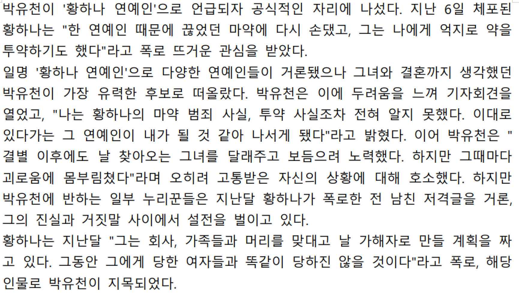 현재 박유천은 마약 투약의혹을 강하게 부인하고 있다.