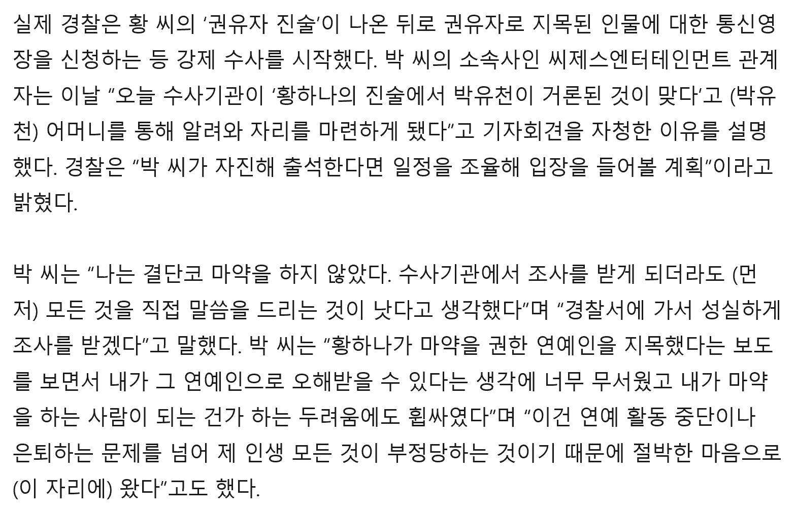 하지만 황하나는 경찰 조사에서 "2015년도에 처음 필로폰을 투약하고 끊었지만 지난해에 박유천의 권유로 다시 마약을 하게 됐다"고 주장하고 있다.