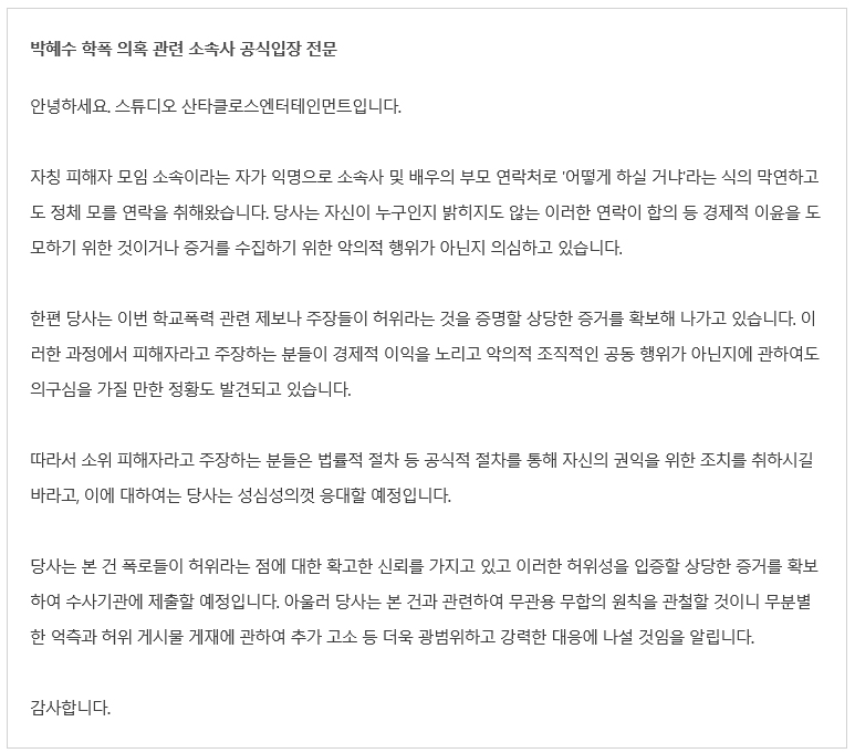 박혜수 소속사 스튜디오 산타클로스 엔터테인먼트는 24일 공식 입장문을 통해 "자칭 피해자 모임 소속이라는 자가 익명으로 소속사 및 배우의 부모 연락처로 '어떻게 하실 거냐'는 식의 막연하고도 정체 모를 연락을 취해왔다. 당사는 자신이 누구인지 밝히지도 않는 이러한 연락이 합의 등 경제적 이윤을 도모하기 위한 것이거나 증거를 수집하기 위한 악의적 행위가 아닌지 의심하고 있다"고 전했습니다.