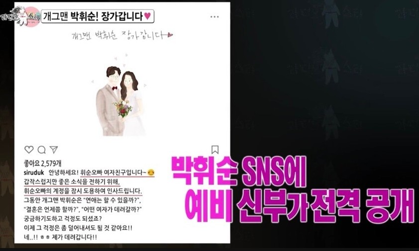 박휘순 SNS 를 통해 "휘순 오빠 여자 친구입니다"라는 시작과 함께 깜짝 결혼 발표를 하게 된 것이지요.