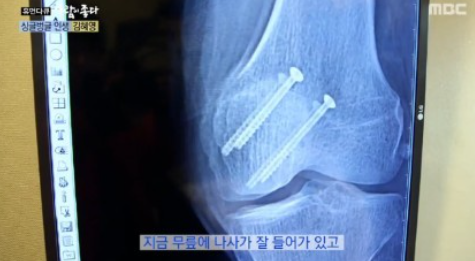 또 한 번은 지하 주차장에서 슬리퍼를 신고 넘어지면서 무릎뼈가 깨지면서 걷지 못할 정도의 상태였다고 하는데요. 뼈에 나사를 박는 등 2차 수술까지 진행해야 할 상황이었다고 하는데요. 그런 상황에서도 라디오 진행을 했다고 하는군요.