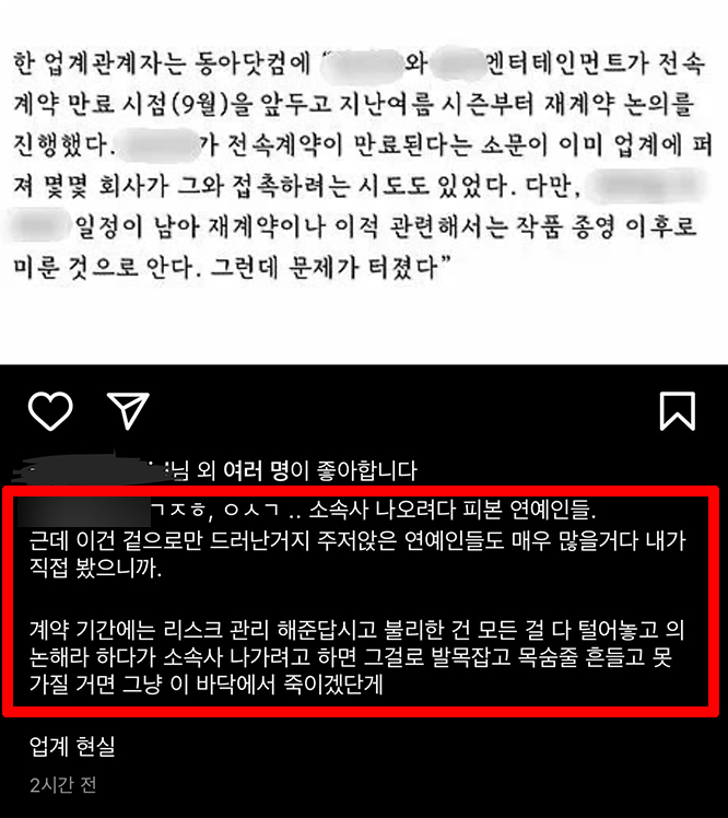 뿐만 아니라 "ㄱㅈㅎ, ㅇㅅㄱ 소속사 나오려다 피 본 연예인들. 이건 겉으로만 드러난거지 주저앉은 연예인들도 매우 만을 거다. 내가 직접 봤으니까"라며 "계약 기간에는 리스크 관리해준답시고 '불리한 건 모든 걸 다 털어놓고 의논해라' 하다가 소속사 나가려고 하면 그걸로 발목 잡고 목숨줄 흔들고 못 가질 거면 그냥 이 바닥에서 죽이겠단 게 업계 현실"이라고 적어 눈길을 끌었습니다.