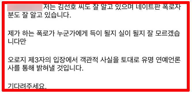 이어 "제가 하는 폭로가 누군가에게 득이 될지 실이 될지 잘 모르겠습니다만 오로지 제3자의 입장에서 객관적 사실을 토대로 유명 연예 언론사를 밝혀내겠다"고 폭로를 예고했습니다.