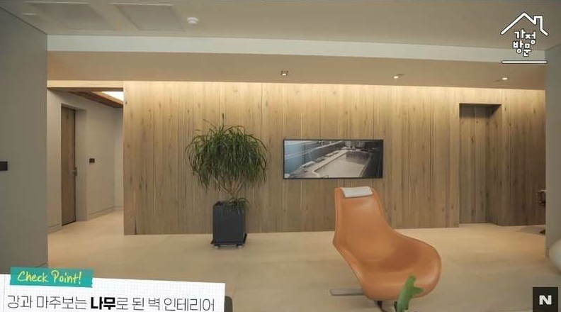 거실창의 반대편은 나무 벽으로 마감했는데, 김성령은 "한쪽은 강이 보이기 때문에 한쪽 벽은 다 나무로 꾸몄다. 아파트지만 시멘트 느낌보단 핀란드에서 온 나무로 나무의 느낌을 살리고 싶었다"고 설명했습니다.