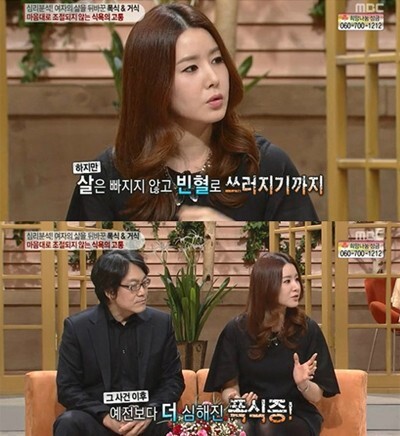 "어느 날 졸업식 사진을 봤는데 내 뚱뚱한 모습에 충격을 받고 다이어트를 결심한 후 커피 우유 하나씩만 먹으며 버텼다. 예전에 음식을 먹은 후 먹지 않아야 할 음식을 먹었다는 생각에 억지로 구토를 시도한 적이 있었다"며