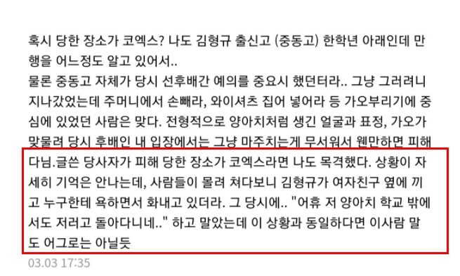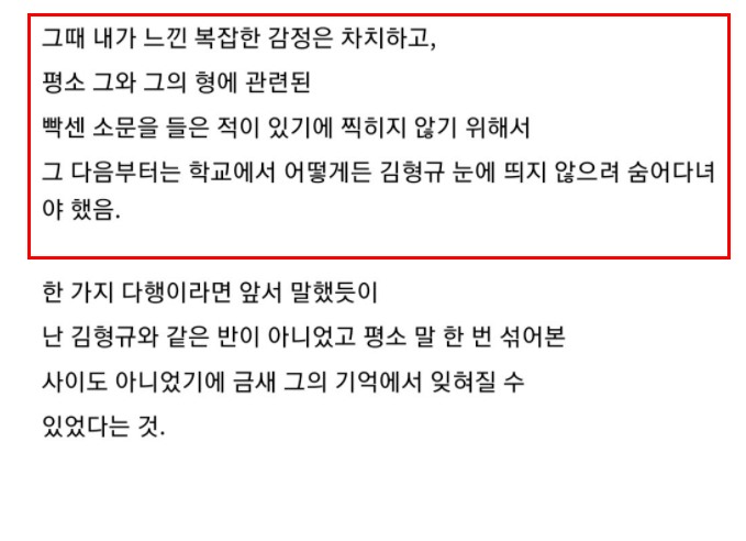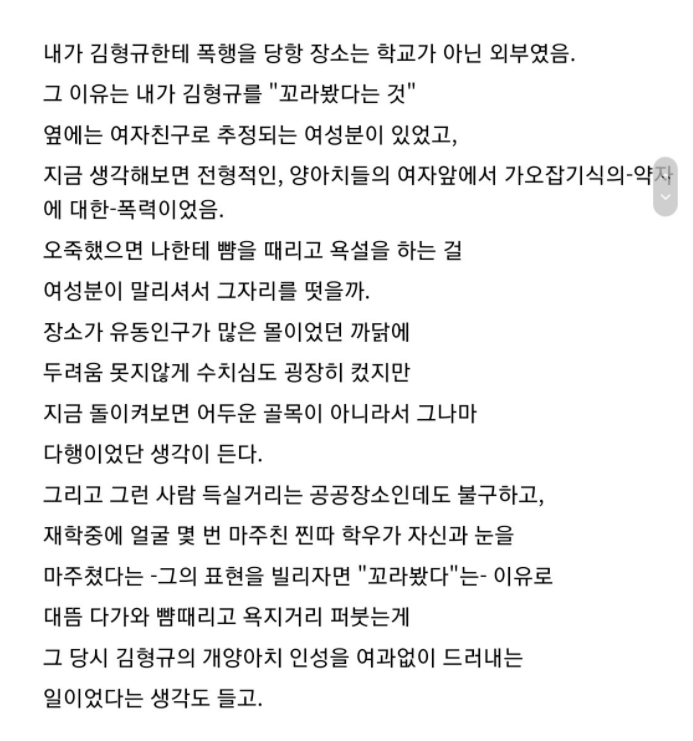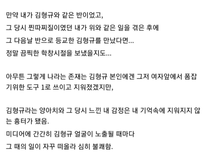 글쓴이는 또 "장소가 유동인구가 많은 곳이었던 까닭에 두려움 못지않게 수치심도 굉장히 컸지만 지금 돌이켜보면 어두운 골목이 아니라서 그나마 다행이었다는 생각이 든다"며 "그때 내가 느낀 복잡한 감정은 차치하고, 평소 그와 그의 형에 관련된 센 소문을 들은 적이 있기에 찍히지 않기 위해서 그 다음부터는 학교에서 어떻게든 김형규 눈에 띄지 않으려 숨어다녀야 했다"고 털어놨습니다.