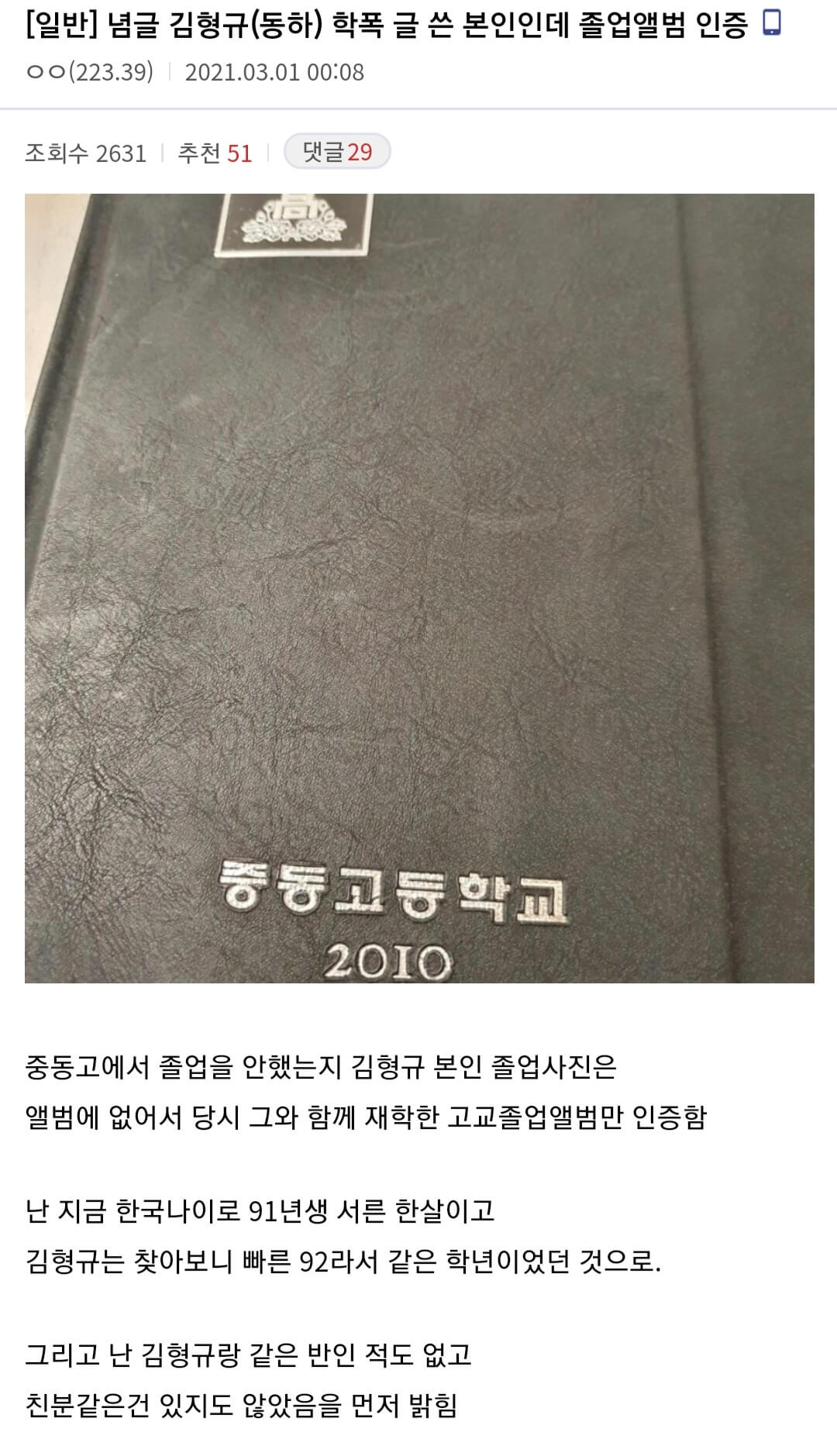 글 작성자는 "중동고에서 졸업을 안 했는지 김형규 본인 졸업사진은 앨범에 없어서 당시 그와 함께 재학한 고교 졸업 앨범만 인증한다"며 졸업 앨범 사진을 공개했습니다.