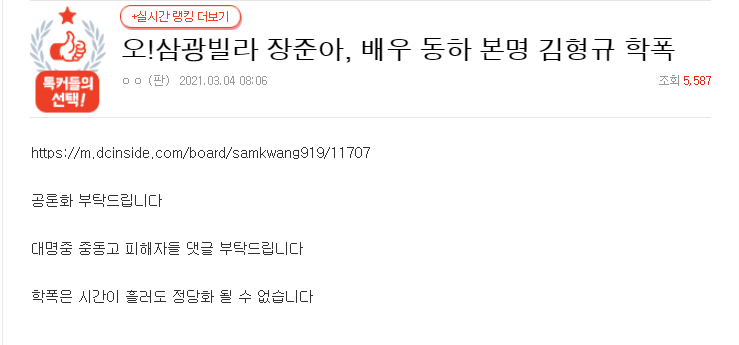 동하에 대한 학폭 폭로가 올라온 것은 2021년 3월 4일입니다. 요즘 학폭 폭로의 주요 무대가 되고 있는 네이트 판에는 '오 삼광빌라 장준아, 배우 동하 본명 김형규 학폭'이라는 제목의 글이 올라왔습니다.