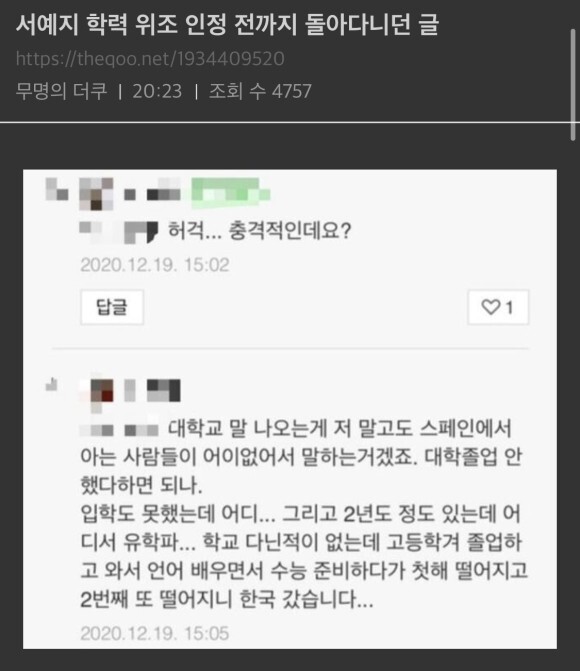 서예지가 갔다고 말한 대학이 스페인의 서울대급이라서... 사실 거기 들어간 게 찐이면 졸업 못 하고 입학만 했어도 대대적으로 언플을 했을 건데 그것도 아니고.. 거기다 스페인 교포인지 유학생인지 사람들이 쓴 서예지 썰이 몇개 있는데 그 썰에서는 대학 입학 한 거 아니라고 함 적당히 보고 걸러야하는 거긴 하지만...